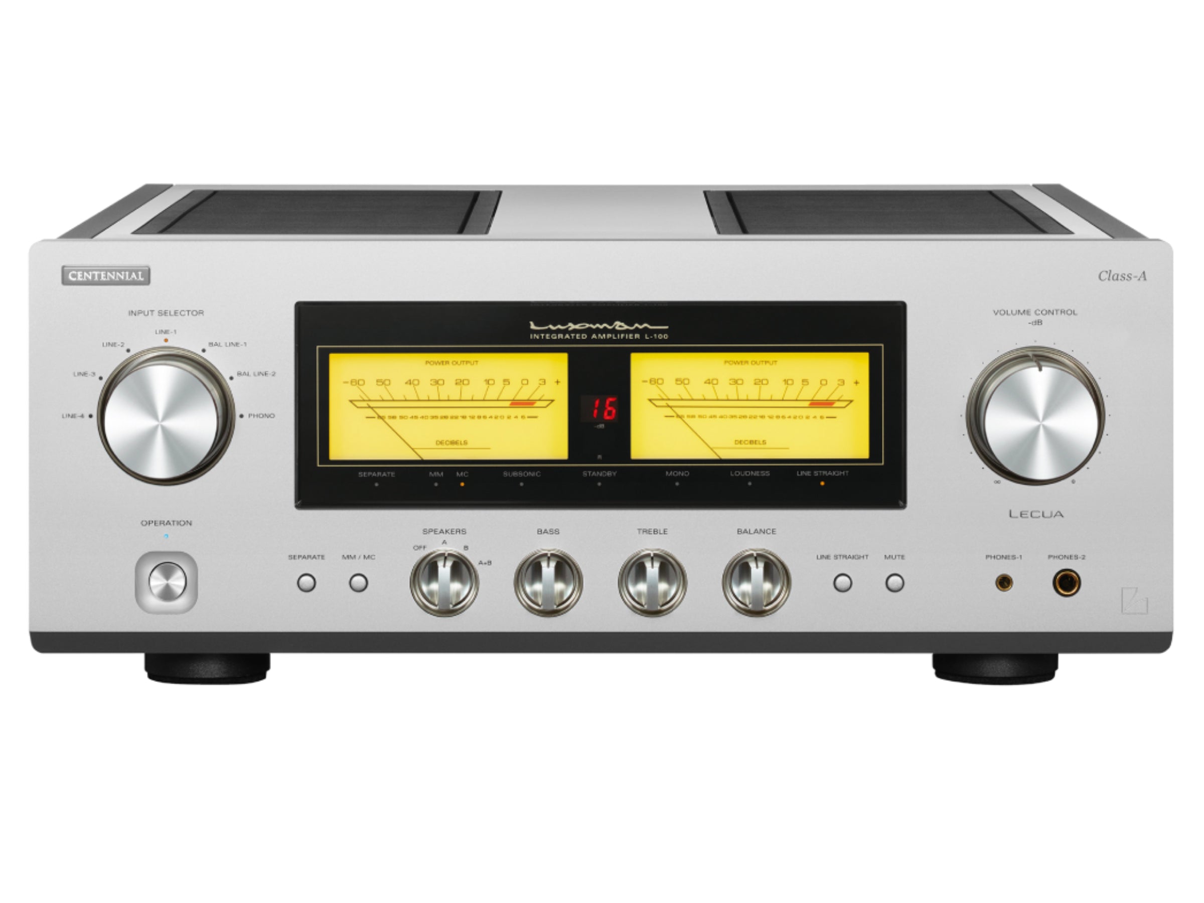 The L-100 CENTENNIAL is LUXMAN’s first pure Class-A integrated amplifier to employ our company’s LIFES core circuit technology, achieving a delicate, smooth and richly textured sound with a densely musical authority, genuine hallmarks of true Class-A amplification. Its warm sonic character is visually expressed through illuminated needle-type analog meters with soft yellow backlighting that respond dynamically to music. The front panel features a refined contrast of brushed white finish and a glossy chrome “CENTENNIAL” badge, signifying its status as one of our 100th-anniversary models. Between the dual meters sits a 7-segment LED display that shows attenuation level, allowing precise volume confirmation from the listening position. Both the meter illumination and LED display can be independently turned on or off via the remote control.