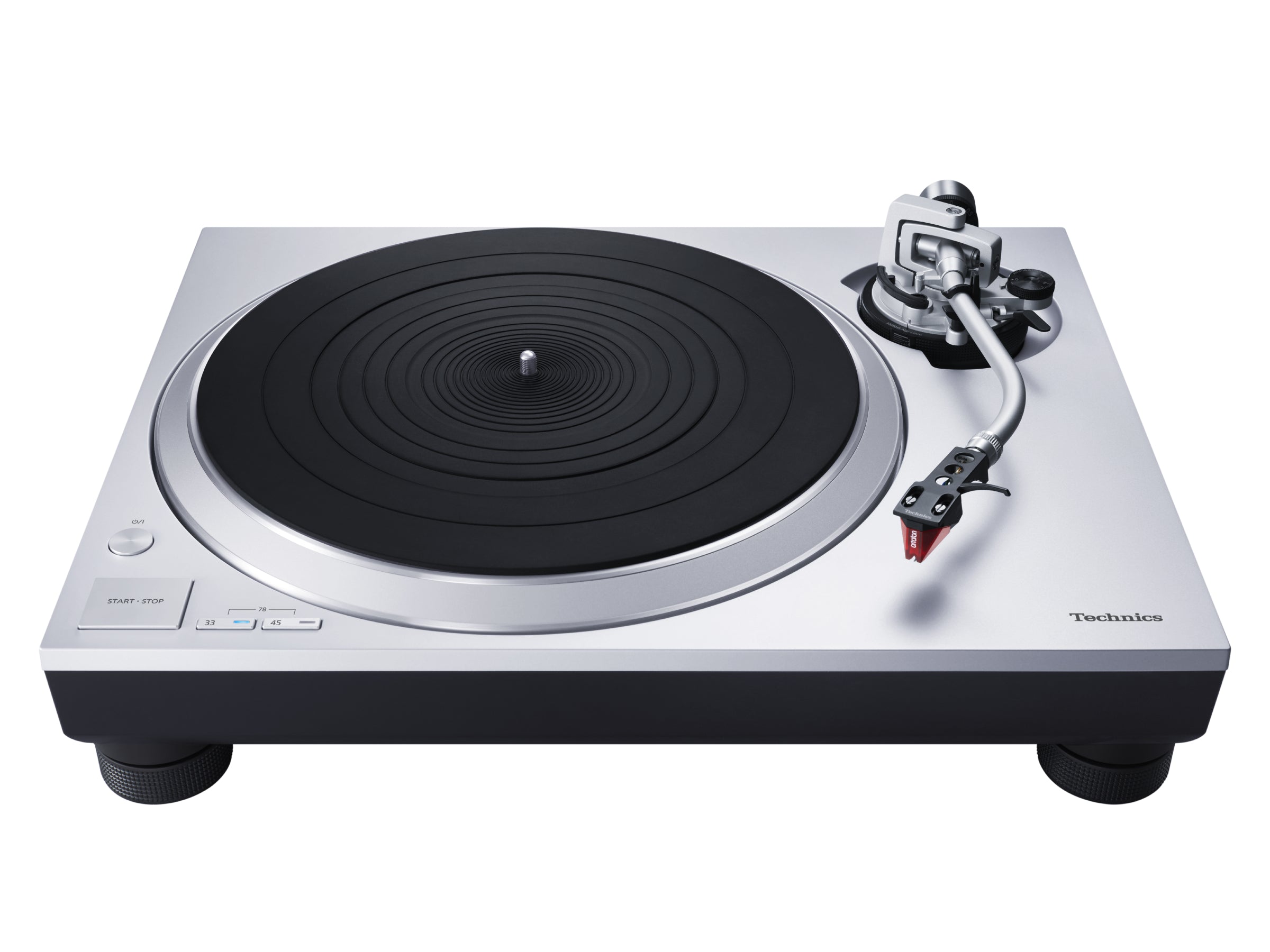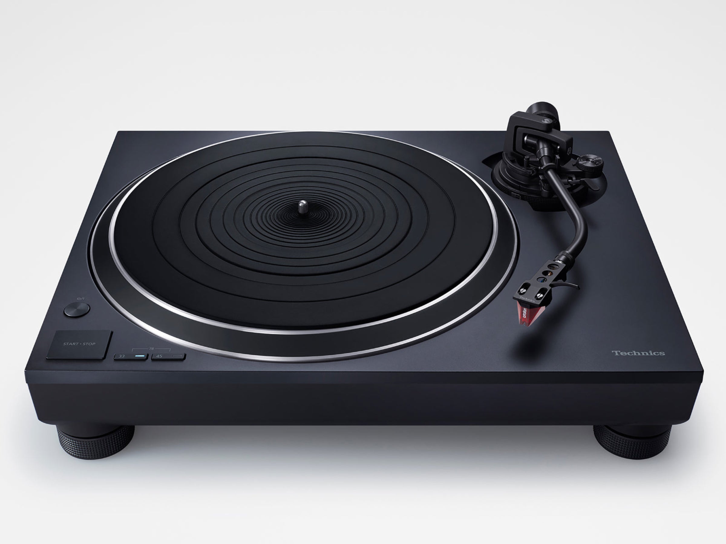 The technologies acquired through the development of the SL-1200 Series and the high-end SL-1000R model were lavishly inserted into the motor drive unit, a key part of the turntable. The motor exclusively tunes the single-rotor, coreless direct drive motor adopted by the SL-1200GR in order to read the high rotation accuracy and high-precision signals of the record. Optimal motor control is conducted for the inertial mass of the two-layer structure platter on which the vinyl record is placed with deadening rubber on the entire back surface to eliminate unwanted resonance in the aluminium die-cast platter to eliminate the rotation irregularity called cogging. The aluminium die-cast chassis is rigidly integrated with a special material consisting of ABS mixed with glass fiber to achieve a two-layer construction. The insulator is comprised of a spring and rubber to provide optimal vibration-damping characteristics. The tonearm is a static-balance universal S-shape tonearm, another Technics tradition. By adopting a high-precision bearing using the same gimbal suspension construction and machined housing as the SL-1200 Series, high initial sensitivity is achieved. In addition, reliability has been improved by incorporating a removable power cable and gold-plated terminals, which have less sound quality degradation, for the PHONO and LINE terminals.