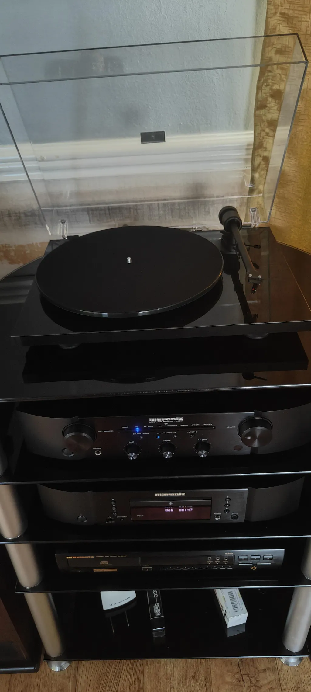| Platter: | Heavy 8mm, blasted-glass platter with felt mat |